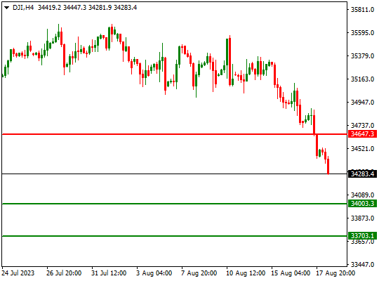 مضى مؤشر الداو جونز فى اتجاه هابط , ثم استمر هذا الاتجاه . كما يوضح الرسم البيانى أدناه , بناءً على ذلك، نتوقع هبوط سعر المؤشر الداو جونز , حيث سنقوم بالبيع من سعر 34285 دولار ، مع تعزيز نقطه الشراء عند المستوى 34000 دولار و أن يكون المستهدف منطقة 33700 دولار . يُنصح أيضًا باختيار منطقة 34645 دولار كنقطة وقف الخسارة للتحكم في المخاطر.