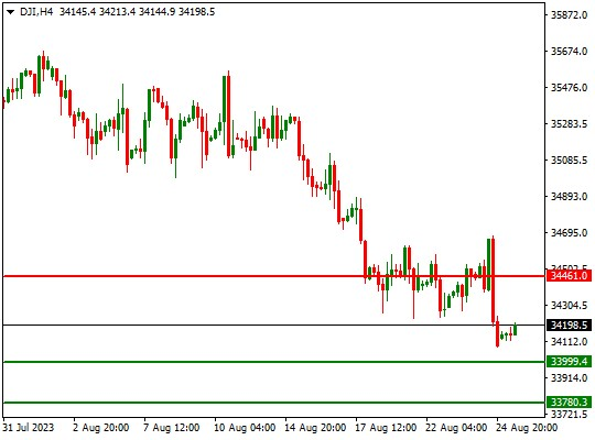 مضى مؤشر الداو جونز فى اتجاه هابط , ثم استمر هذا الاتجاه . كما يوضح الرسم البيانى أدناه , بناءً على ذلك، نتوقع هبوط سعر المؤشر الداو جونز , حيث سنقوم بالبيع من سعر 34198 دولار ، مع تعزيز نقطه البيع عند المستوى 33999 دولار و أن يكون المستهدف منطقة 33780 دولار . يُنصح أيضًا باختيار منطقة 34461 دولار كنقطة وقف الخسارة للتحكم في المخاطر.