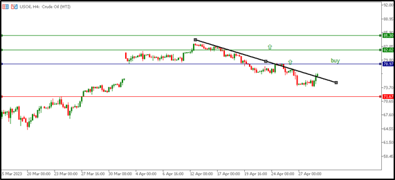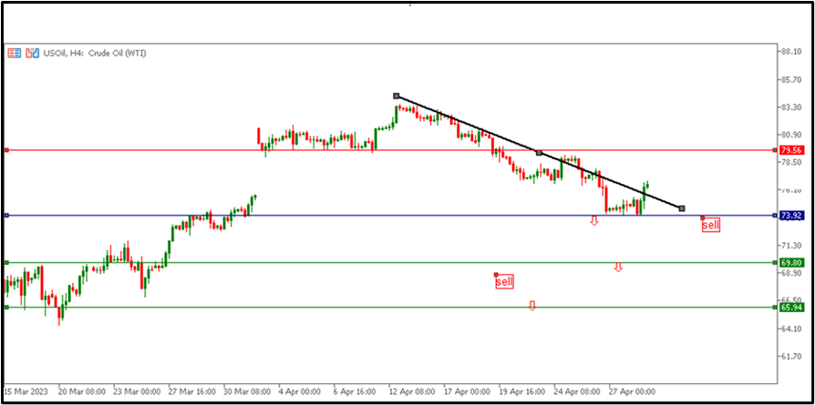 Last week, oil witnessed a decline, as oil began to decline two weeks ago from now until the previous week, so oil trading began last week on Monday 4/24/2023 from the region of 77 dollars per barrel, and from this region, oil reached the highest trading point in the week, which is 79 dollars per barrel Then, oil covered its decline until closing on Friday 4/28/2023, with an attempt to rise at the region of 76 per barrel, and the US crude oil inventories data came less than expected, as the expected was -1.3M, and the actual result appeared less than expected, and it appeared -5.1M, and accordingly, the impact of that on Oil prices