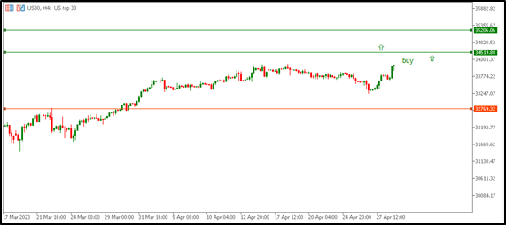 The beginnings of the Dow Jones index last week were in an ascending direction, now that the index had tried to drop, then went back up and closed at the beginning of the shift to the upside, as it started trading from the area 33792 on Monday 4/24/2023 to reach its highest peak on Friday 4/28/2023 At the area of 34090, trading was closed at this area, and the Dow Jones index interacted with the data that was issued last week, including the US Consumer Confidence Index (CB). It came less than expected, as it was expected to issue 104.1, but it decreased to issue 101.3.